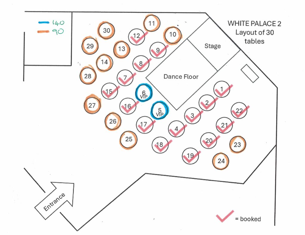 | Seating | VIP Table 5-10, VIP Table 6-10, Reg Table 10-10, Reg Table 11-10, Reg Table 13-10, Reg Table 14-10, Reg Table 23-10, Reg Table 24-10, Reg Table 25-10, Reg Table 26-10, Reg Table 27-10, Reg Table 28-10, Reg Table 29-10, Reg Table 30-10 |
