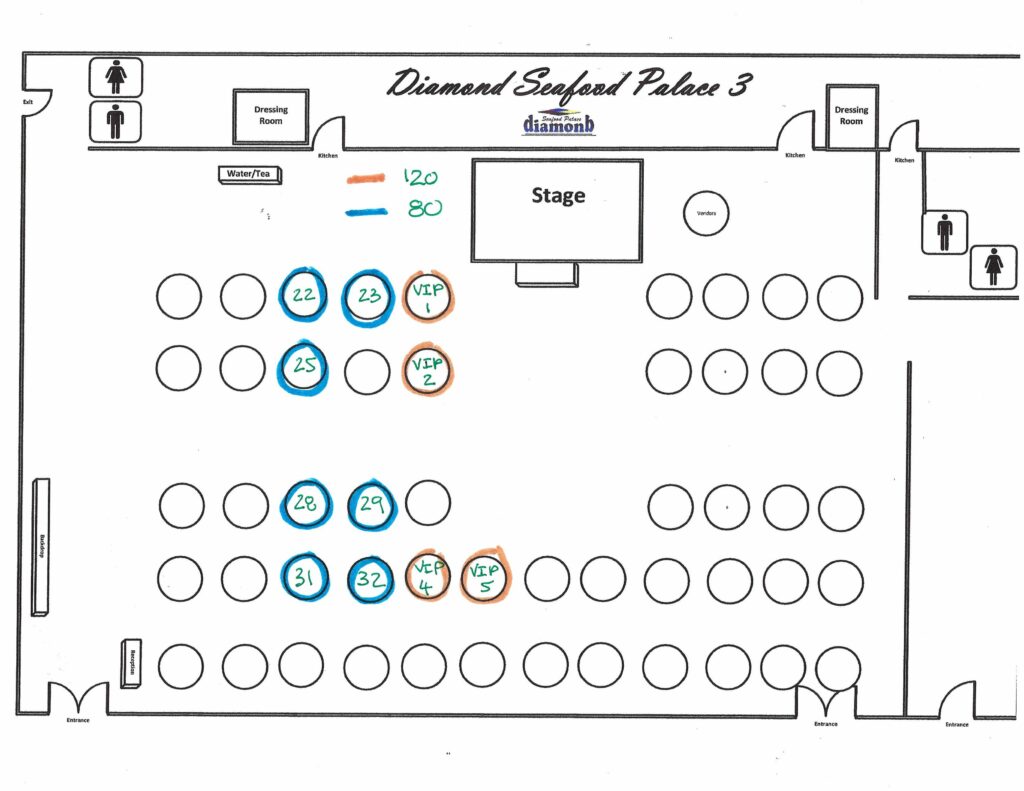 | Seating | VIP Table 1-10, VIP Table 2-10, VIP Table 4-10, VIP Table 5-10, REG Table 22-10, REG Table 23-10, REG Table 25-10, REG Table 28-10, REG Table 29-10, REG Table 31-10, REG Table 32-10 |