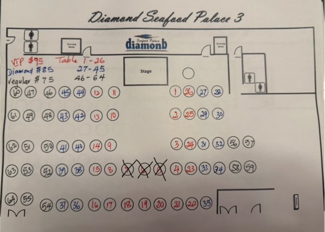 | Seating | VIP Table 11-10, VIP Table 13-10, VIP Table 9-10, VIP Table 15-10, VIP Table 16-10, Diamond Table 43-10, Diamond Table 40-10, Diamond Table 44-10, Diamond Table 36-10, Diamond Table 39-10, REG Table 46-10, REG Table 49-10, REG Table 50-10, REG Table 53-10, REG Table 61-10, REG Table 51-10, REG Table 63-10 |